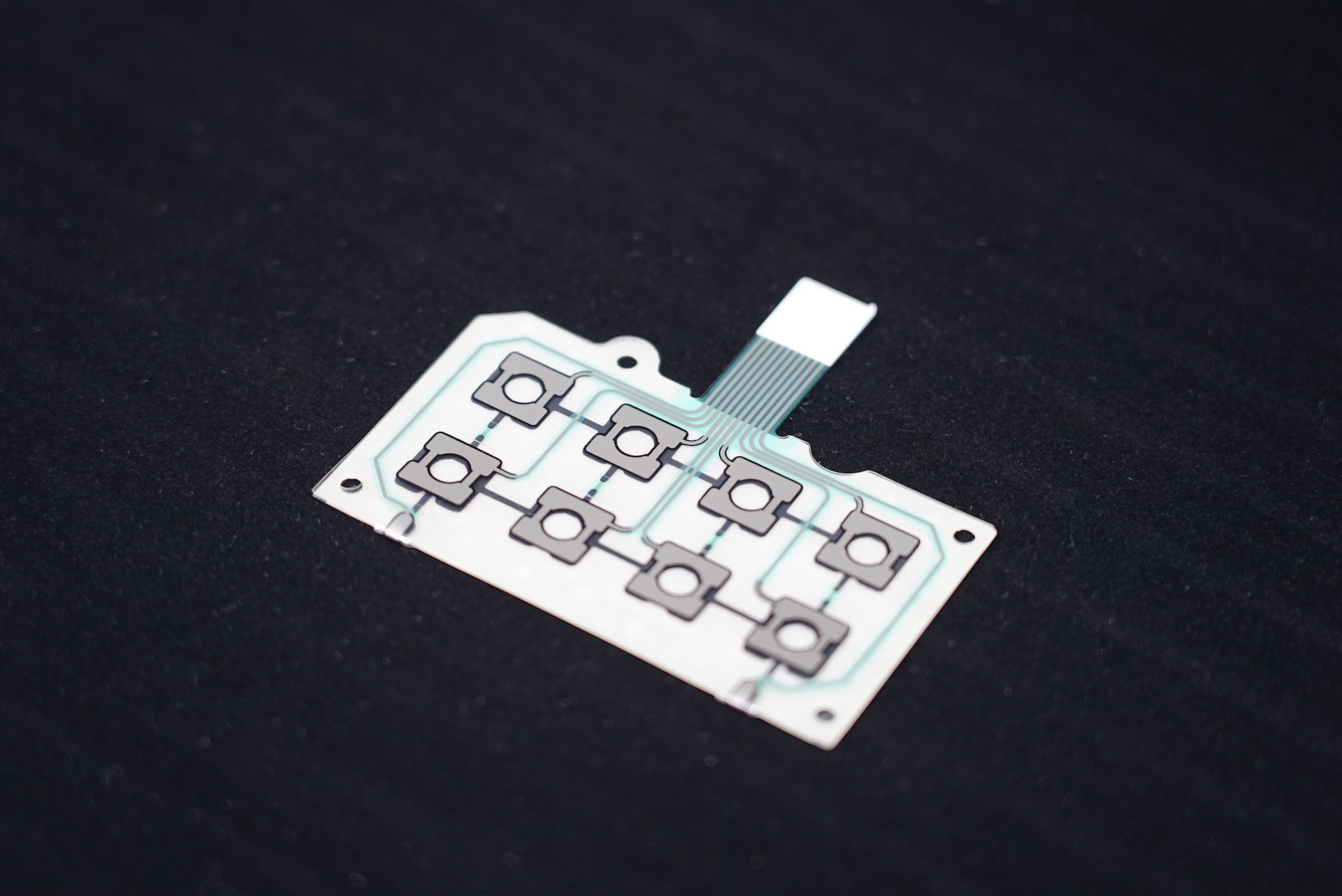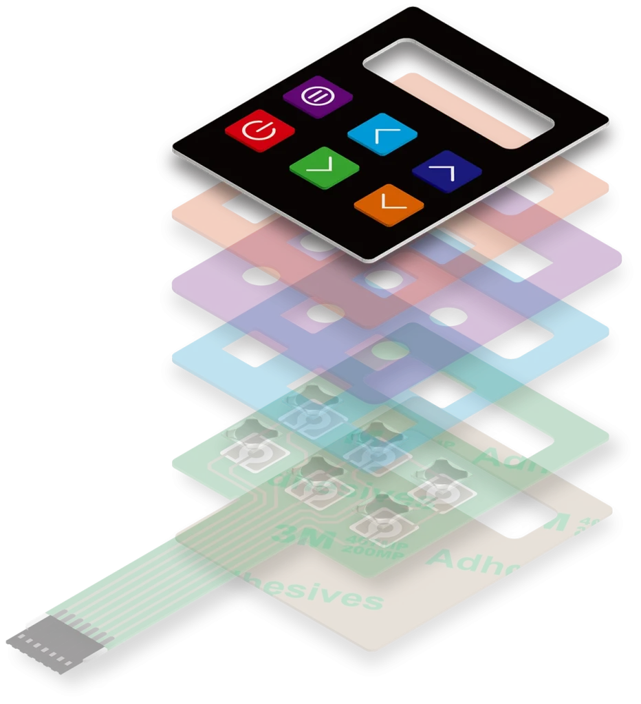회로층과 스페이서 층 사이에 메탈 돔을 넣어 접점을 만들어내는 스위치로 얇지만 우수한 촉각 피드백과 내구성이 높습니다.